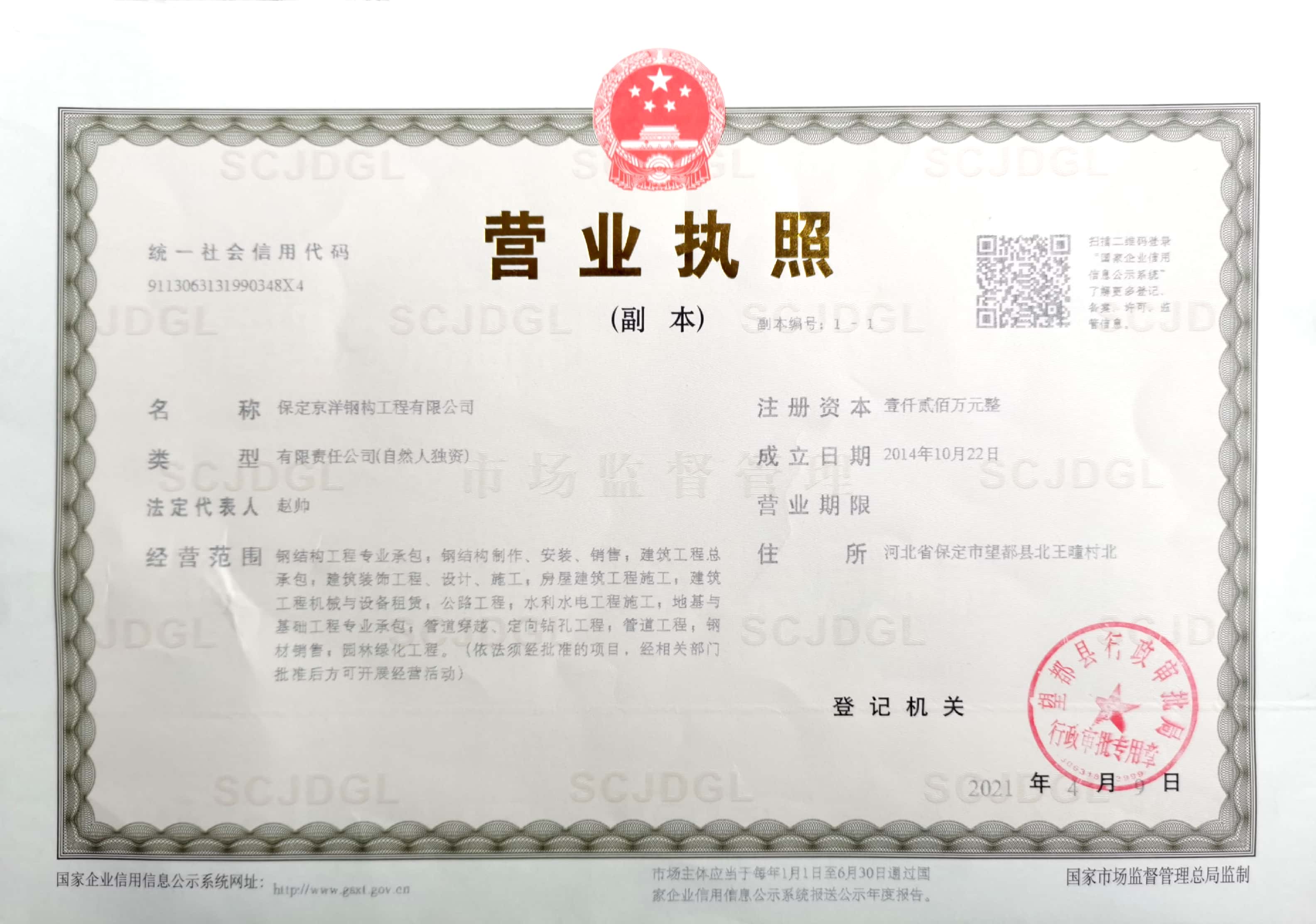 保定京洋鋼構(gòu)工程有限公司位于千年古縣望都。望都縣處于京津冀核心區(qū),是對接京津的交通要塞。距北京180公里,天津170公里,石家莊機場70公里。京石高鐵、京廣鐵路、京港澳高速、107國道四條交通大動脈縱貫全縣。圍繞望都南北各一座高鐵站,定州站(30公里)和保定站(35公里)。京昆高速、保阜高速均有連接線,四條省級公路縱橫交錯,交通便捷。